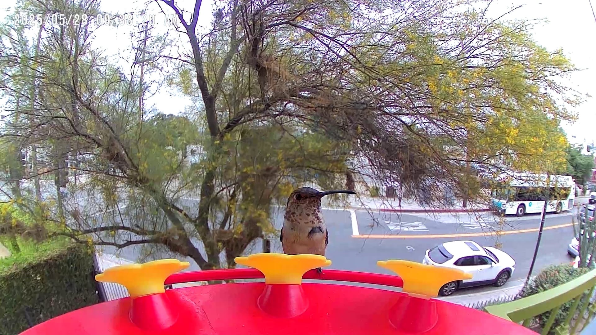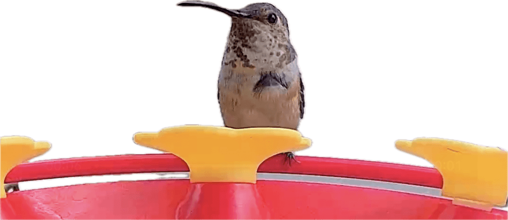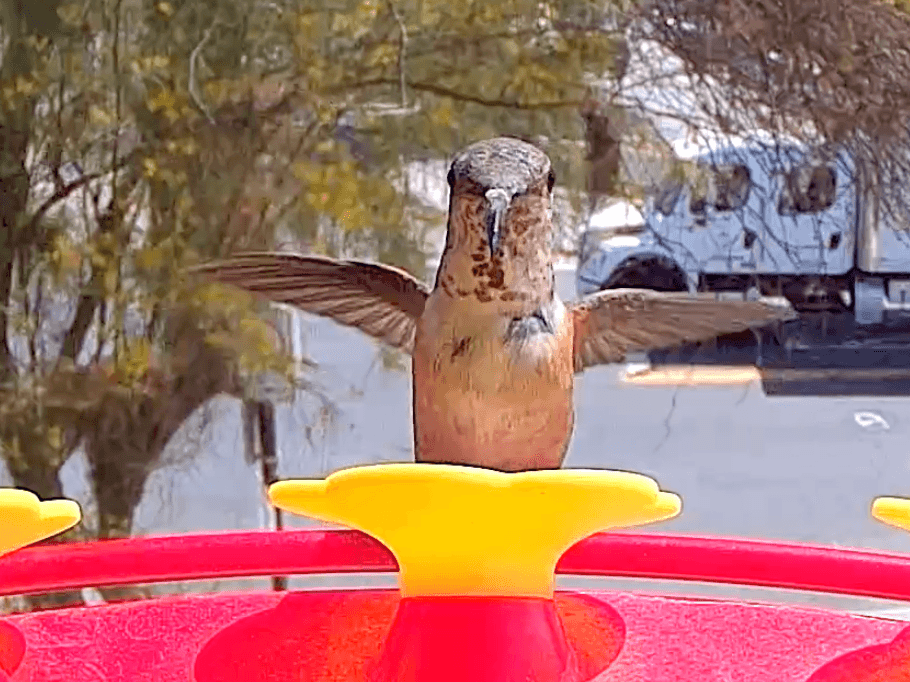 | Appearance | Larger splotch on left breast, like jam spilled on her. Slightly crooked beak.Light belly with cinnamon tones in some light, but no red has been observed. |